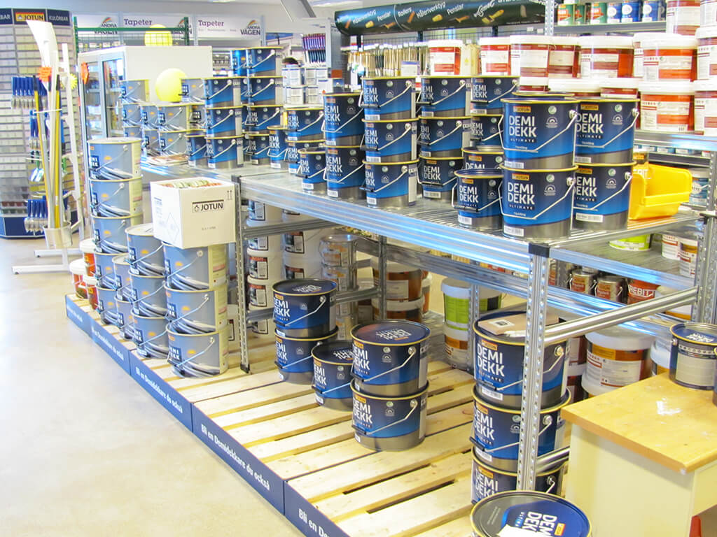 Jeśli chodzi o półki sklepowe, możemy zaproponować klientom również inne rozwiązanie – regały paletowe. W systemach tego typu łączymy funkcję składowania palet na wyższych poziomach ze składowaniem ręcznym – na niższych poziomach. Sklepowe regały magazynowe paletowe doskonale sprawdzają się m.in. w marketach DIY.